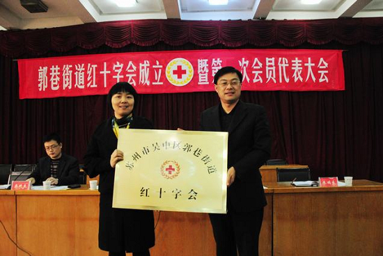 大会由街道党工委副书记秦晓良主持,吴中区政府办副主任姚胜武、吴中区红十字会专职副会长朱瑞良、郭巷街道党工委副书记、办事处主任徐建文、郭巷街道党工委委员、办事处副主任沈映珍、街道各社区书记、妇女主任、团委成员等出席了大会。沈映珍同志作郭巷街道红十字会筹备工作情况报告,吴中区红十字会专职副会长朱瑞良为郭巷街道红十字会授牌。