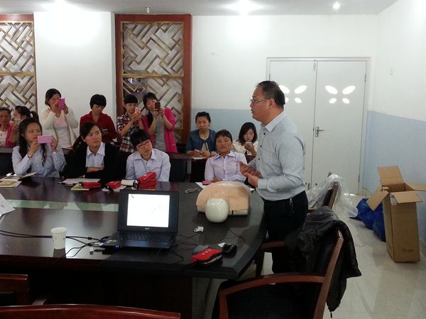 此次培训邀请了昆山市六院急诊科袁靖主任,针对学龄儿童日常突发事件的应急救护进行了系统的讲解,通过理论和实际相结合的教学演示方式,为老师们讲解了应急救护的新概念及心肺复苏的理论知识,并且示范心肺复苏的实际操作过程。培训过程中,大家熟练掌握了如何判断病人心跳呼吸停止、心肺复苏的指征、操作步骤、救助过程中的注意事项等。现场气氛热烈,大家积极思考并提问,认真掌握操作要领。