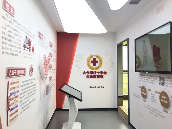 为融合多方资源,融合中心工作,融合多元力量,太仓规划建设了城市党建融合服务中心,建筑面积1500平方米。太仓市红十字生命教育馆位于服务中心的三楼,馆内展区介绍了红十字运动历史知识、红十字工作职责,以及心肺复苏、海姆立克等常见急救知识,同时配置了电子触摸屏、模型、急救包展示区域,通过寓教于乐的形式传播红十字理念和救护知识。教育馆隔壁配套安排了一大一小两个多功能会议室,为推进应急救护培训、安全体验和红十字传播提供了有利条件。