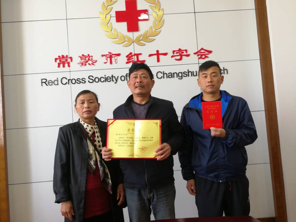 4月8日,常熟市支塘镇任阳凤凰新村的59岁老汉曹建初在常熟市红十字会高兴地拿到了第134号报名捐遗证书和纪念证,一同随来的儿子也表达了相同的捐遗愿望。