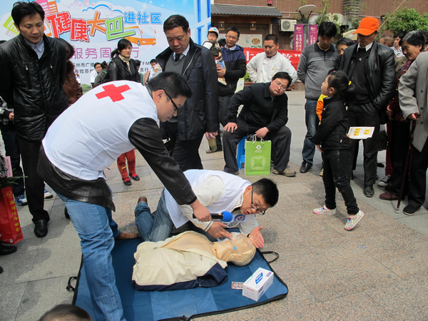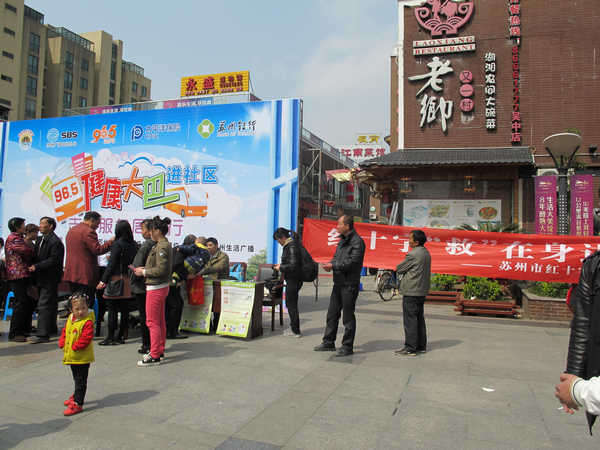4月21日上午,是“965”健康大巴进社区活动日,苏州市红十字会应广电总台苏州生活广播邀请,走进吴中区阳光水榭小区,为小区居民现场演示心肺复苏术,并发放100本《市民应急指南》,启动了2013苏州红十字“救”在身边社区行活动。