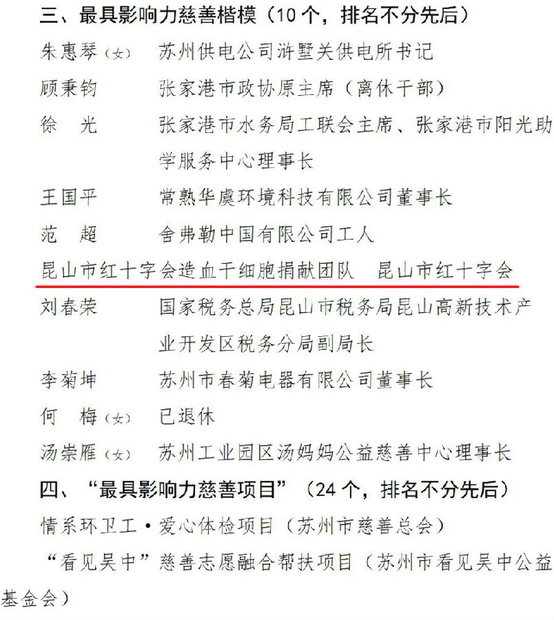 近日,苏州市政府网站公布了第五届“苏州慈善奖”获奖名单,表扬鼓励2019至2020年间为全市慈善事业发展,做出突出贡献的企事业单位、社会组织和先进个人,昆山市红十字会造血干细胞捐献团队荣获“最具影响力慈善楷模”。