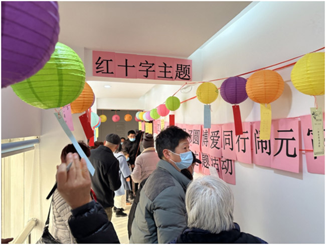 150多条精选的灯谜高高悬挂在社区活动室的走廊上,营造出了浓厚欢乐的节日氛围。内容丰富的灯谜吸引了大家,谜面有趣而通俗,并融入了不少红十字元素,社区居民群众、青少年们有的默默思考,有的积极讨论。猜对谜底的居民们都能领取一份小礼品,现场洋溢着欢乐、祥和、喜庆的气氛。