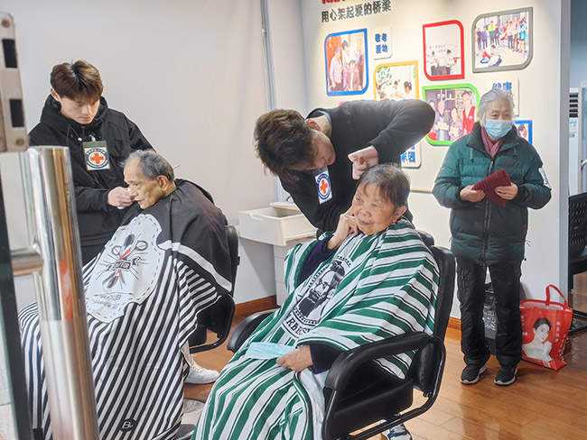 天气寒冷,寒意沁人,但博爱家园的理发室内却春意融融。来自文峰美发有限公司的三名红十字志愿者,正为前来的10多位居民提供义务理发服务。居民们纷纷说:“理发室今天重新开张,说明疫情向好,我们才能放心来理发。”家在附近的老孙头在博爱家园接受理发服务已多年,他看到翘首以盼的红十字志愿者,内心非常高兴。老孙头说:“这次理发等了好久,红十字志愿者服务态度好,理的发也有款有型,让我十分满意。”