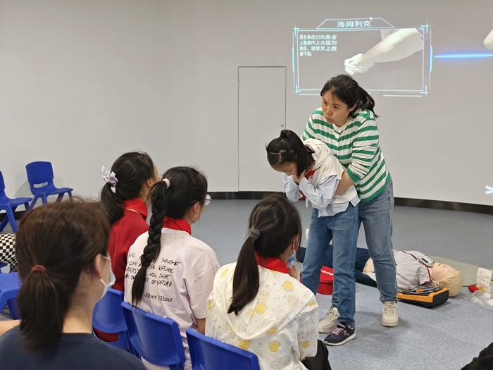 活动最后,来自太仓市红十字会的救护培训师教会大家海姆立克急救法,教授了从如何判断被救助者是否需要进行心肺复苏,到正确的胸外心脏按压、人工呼吸和AED使用的方法等。