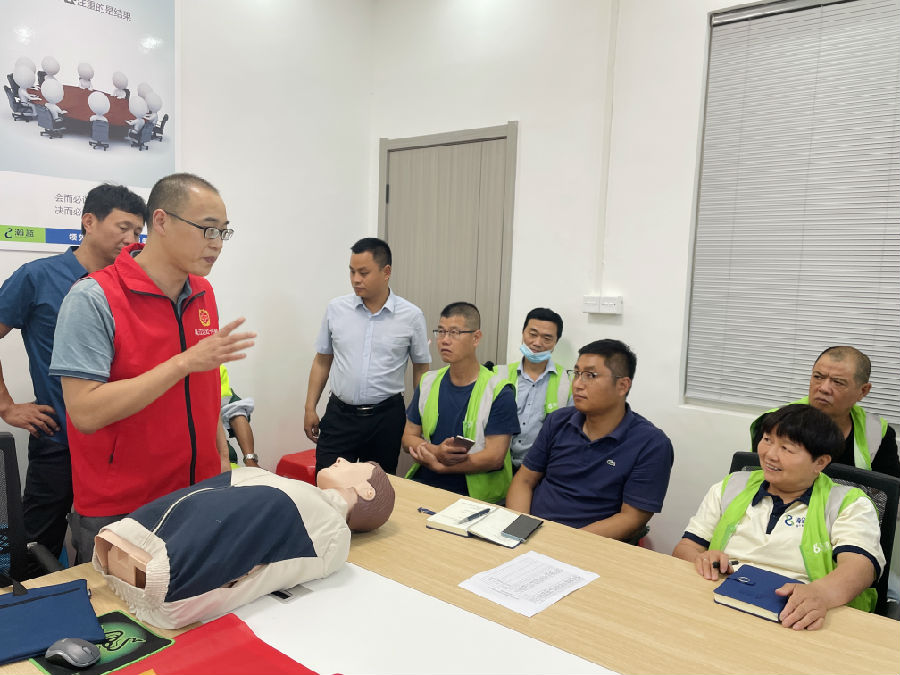 近日,气温逐渐上升,给工作在一线的“城市美容师”带来了新的“烤”验。为增强环卫人员遭遇突发事件的应急救护能力,5月31日下午,吴江七都镇红十字会特邀红十字志愿者为瀚蓝城服部分环卫工人及管理人员开展应急救护技能培训讲座。
