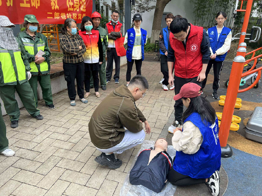 近日,在姑苏区双塔街道二郎巷社区竹苑小游园内举办的“服务集市”便民活动中,红十字志愿者不仅为居民提供免费量血压、理发测量,还提供了现场应急救护技能和知识普及。(陆春明)